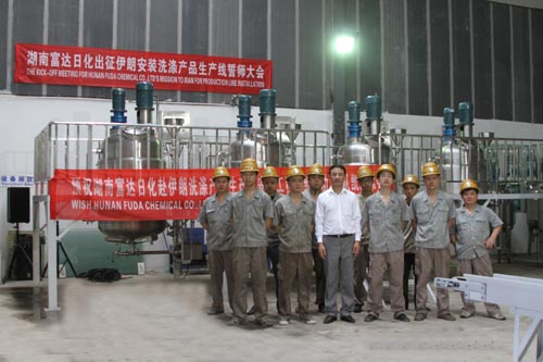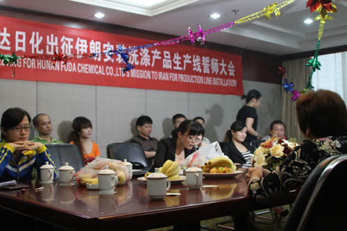 多項專利發明人王先軍 手機:150-7483-5702 手機:195-7316-02886月11日,本公司為技術人員赴伊朗上門服務舉行了誓師大會。在大會上,總經理王先軍先生為技術人員講解了要點,并預祝技術人員凱旋歸來。大會結束后,公司聚餐并舉行了娛樂活動,充分表現出富達日化團結向上的精神。