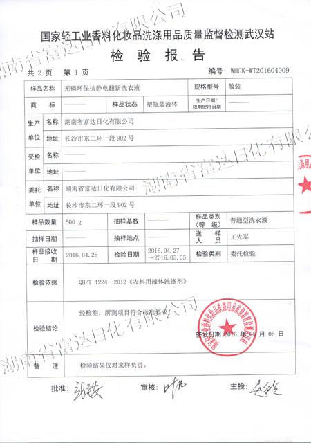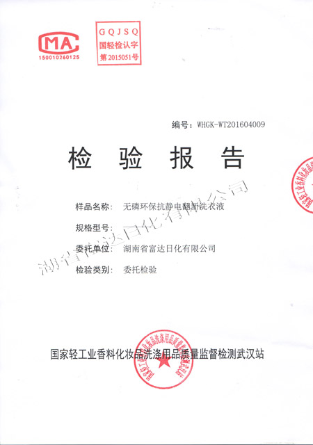 多項(xiàng)專利發(fā)明人王先軍 手機(jī):150-7483-5702 手機(jī):195-7316-02882016年4月,富達(dá)日化用戶周先生反饋: 在周先生銷售洗衣液、洗滌劑的周邊,有一種翻新洗衣液很走俏,他想加盟,可加盟門檻很高,問(wèn)公司能否生研發(fā)生產(chǎn)出類似的產(chǎn)品。收到客戶的反饋后,作為多項(xiàng)專利的發(fā)明人,早在10年前就根據(jù)氧化還原反應(yīng)原理研究過(guò)衣物翻新洗衣液。經(jīng)過(guò)2個(gè)多月的研發(fā),無(wú)磷環(huán)保抗靜電衣物翻新洗衣液按照國(guó)家標(biāo)準(zhǔn)研發(fā)成功,并送檢國(guó)家輕工業(yè)質(zhì)量監(jiān)督檢測(cè)武漢站,于5月下旬通過(guò)環(huán)評(píng)檢測(cè)。