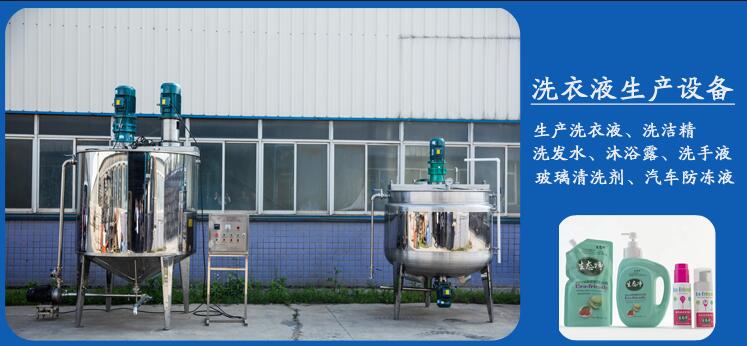 4)洗衣液生產設備:富達日化洗衣液生產設備與傳統攪拌設備不同:洗衣液生產設備上部有高速等離子剪切乳化和攪拌同步,設備下部有螺桿泵或離心乳化泵循環乳化和自動排料;比傳統攪拌機節省時間3倍以上,產品保質期延長2倍以上,由于乳化好、產品濃度大、去污力更強,同等成本下比傳統攪拌機生產的產品提高去污指數30%-40%。同時設備增加恒溫加熱配置,在寒冷的北方,為實用,因冬天氣溫較低,一些洗衣液原料容易被凍住而無法生產,此時,采用加熱可把原料快速分解從而提高效率。