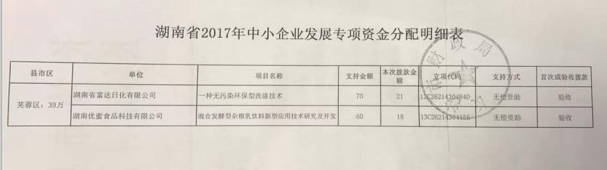 多項(xiàng)專(zhuān)利發(fā)明人王先軍 手機(jī):150-7483-5702 手機(jī):195-7316-02882017年7月26日,根據(jù)湖南省財(cái)政廳關(guān)于下達(dá)2017年中央財(cái)政中小企業(yè)發(fā)展專(zhuān)項(xiàng)資金的通知》(湘財(cái)教指【2017】31號(hào)),將中央財(cái)政中小企業(yè)發(fā)展專(zhuān)項(xiàng)資金予以下達(dá)。由長(zhǎng)沙市財(cái)政局和長(zhǎng)沙市科學(xué)技術(shù)局共同簽發(fā)文件,將相關(guān)款項(xiàng)如數(shù)劃撥到項(xiàng)目承接單位。湖南省富達(dá)日化有限公司申報(bào)的項(xiàng)目“ 一種無(wú)污染環(huán)保洗滌技術(shù)”由中央財(cái)政無(wú)償資助項(xiàng)目項(xiàng)目驗(yàn)收款21萬(wàn)元。截止2017年11月,湖南省富達(dá)日化有限公司再次獲得中央財(cái)政無(wú)償項(xiàng)目資金支持。