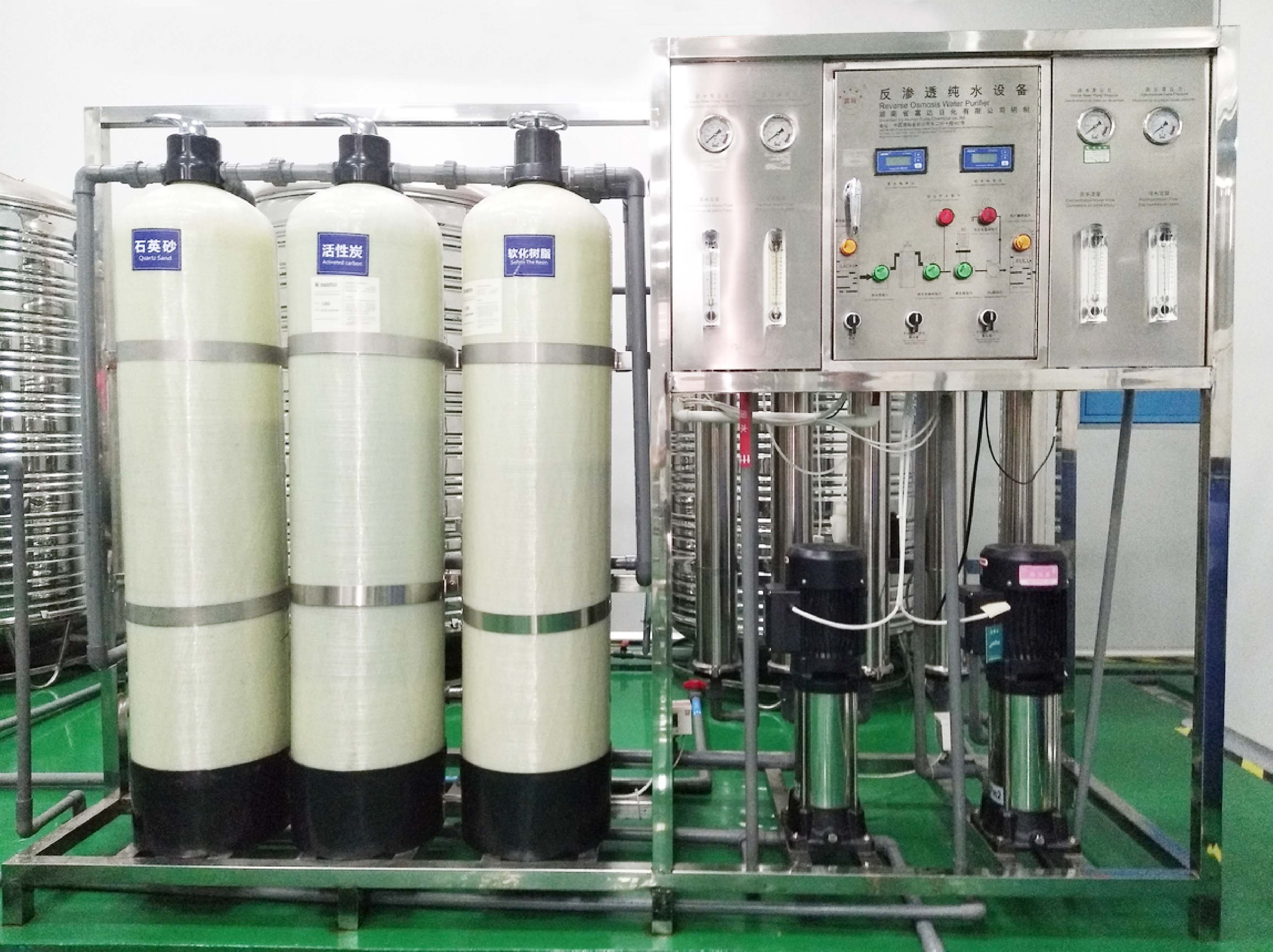 主機架、原水泵、石英砂過濾器、活性炭過濾器、高壓泵、普通反滲透膜、低壓保護器、普通二級反滲透膜、樹脂過濾器、5級保安過濾器。 |